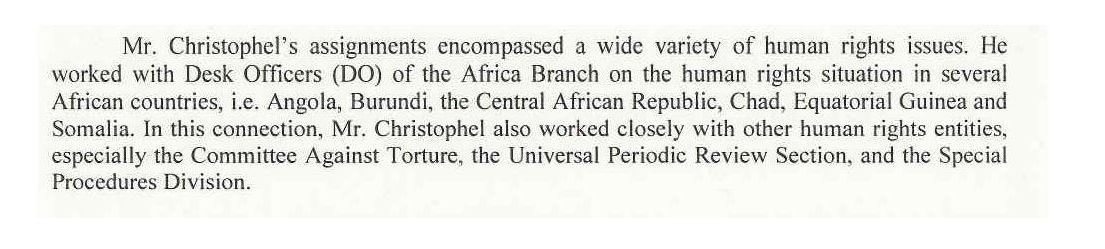 - Mes travaux au sein de l’Unité Afrique du Haut-Commissariat aux Droits de l’Homme des Nations Unies (rédaction de notes de synthèses et de compte-rendu de missions sur les zones Tchad, RDC, Somalie, Angola, Zimbabwe, etc) et au journal Le Monde m’ont appris à connaître les réalités économiques et politiques du continent africain et à travailler avec différents acteurs œuvrant pour le développement de ce continent.